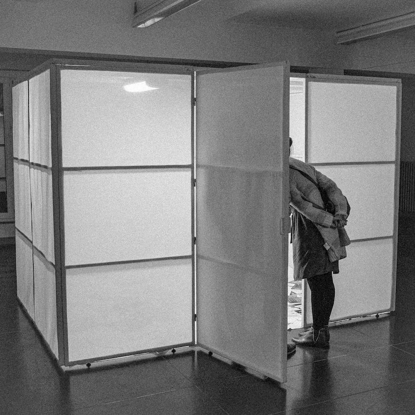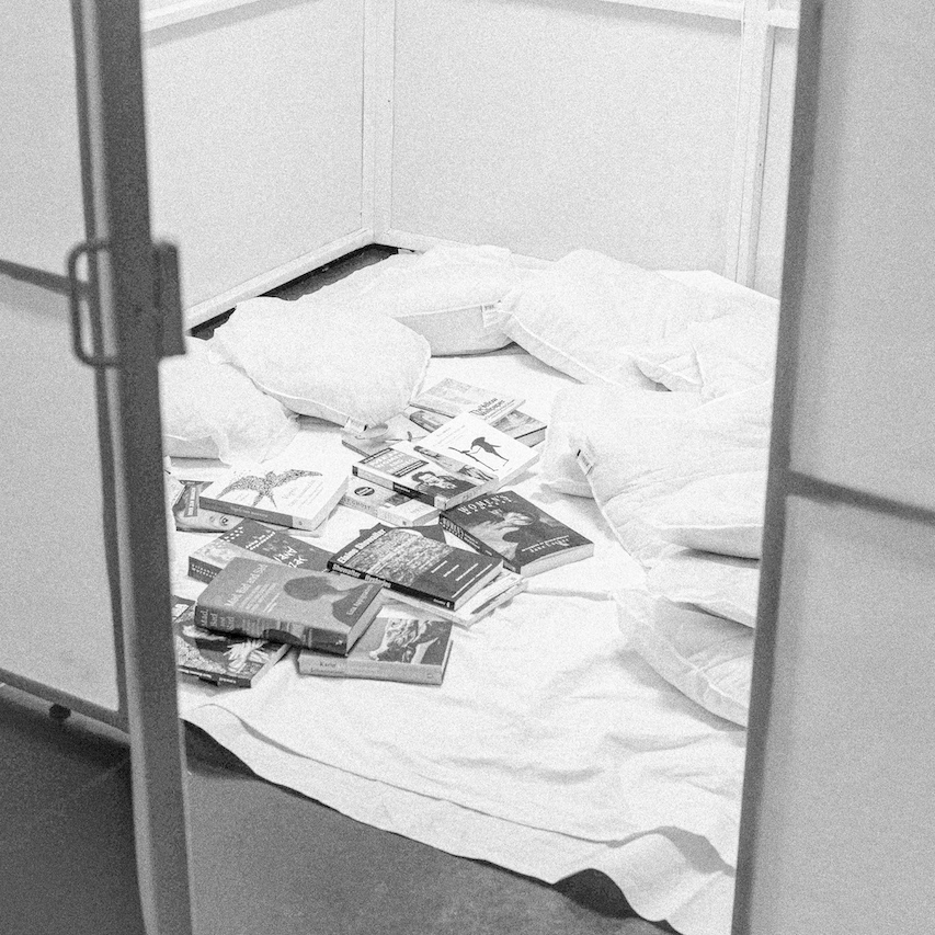 Kaaistudio’s - vierde verdieping - een grote doorschijnende doos in een smetteloze ruimte - witte canvaswanden, warm wit licht, zachte zitkussens, boeken op de grond - pen, papier en een uitnodiging tot schrijven - medisch, historisch, psychologisch en sociologisch onderzoek over vrouwen en waanzin resoneren in de ruimte - een performatieve installatie van Sarah Desmet en Sofie Vandamme over vrouwelijke waanzin: Still CRAZY after all these years?
