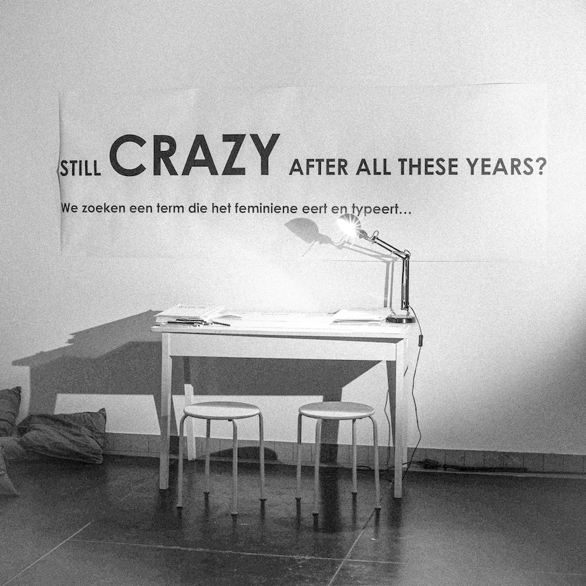 In de geborgenheid van de installatie wordt het publiek uitgenodigd om plaats te nemen en boeken over vrouwelijke waanzin in te kijken. Op de achtergrond is het gedreun te horen van de bij wijlen hallucinante theorieën over vrouwen en waanzin. In dat contrast tussen de innerlijke stemmen in de witte box en de weerklinkende stemmen uit de boxen van de geluidsinstallatie, stelt zich de vraag wat dat vrouwelijke zou zijn dat al eeuwenlang als gek, waanzinnig, hysterie, en dus totally CRAZY wordt bestempeld en tot op vandaag zo makkelijk wordt geassocieerd met psychische kwetsbaarheid. De performatieve installatie Still CRAZY after all these years? nodigt uit om gedachten daarover op papier te zetten.